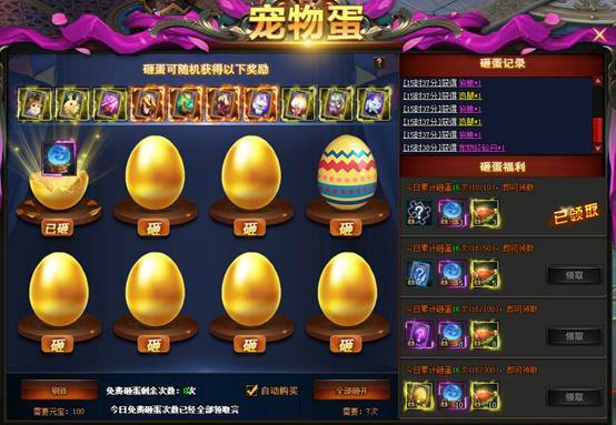 2、 每个角色每天有7次免费的砸蛋机会,之后在线一段时间会增加免费砸蛋机会,最高可再拥有7次免费砸蛋机会。免费次数消耗完后,需要消耗一定元宝砸蛋。