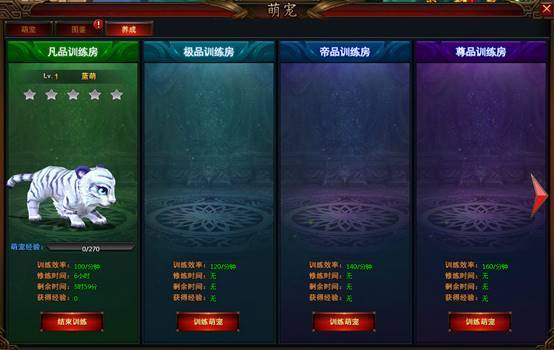 4、 萌宠训练房分为凡、极、帝、尊四个等阶,等阶越高的训练房,在同等时间内训练宠物可获得的经验就越多。